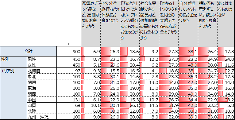 自分推しているものやイベント等の体験を伴うものにお金を使う傾向におり、コト消費に関しては、Z世代女子のスコアが高い傾向。エリア別では【北陸Z世代】が33.0%でトップに。