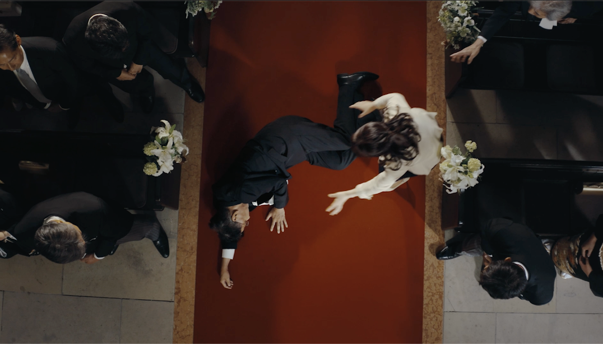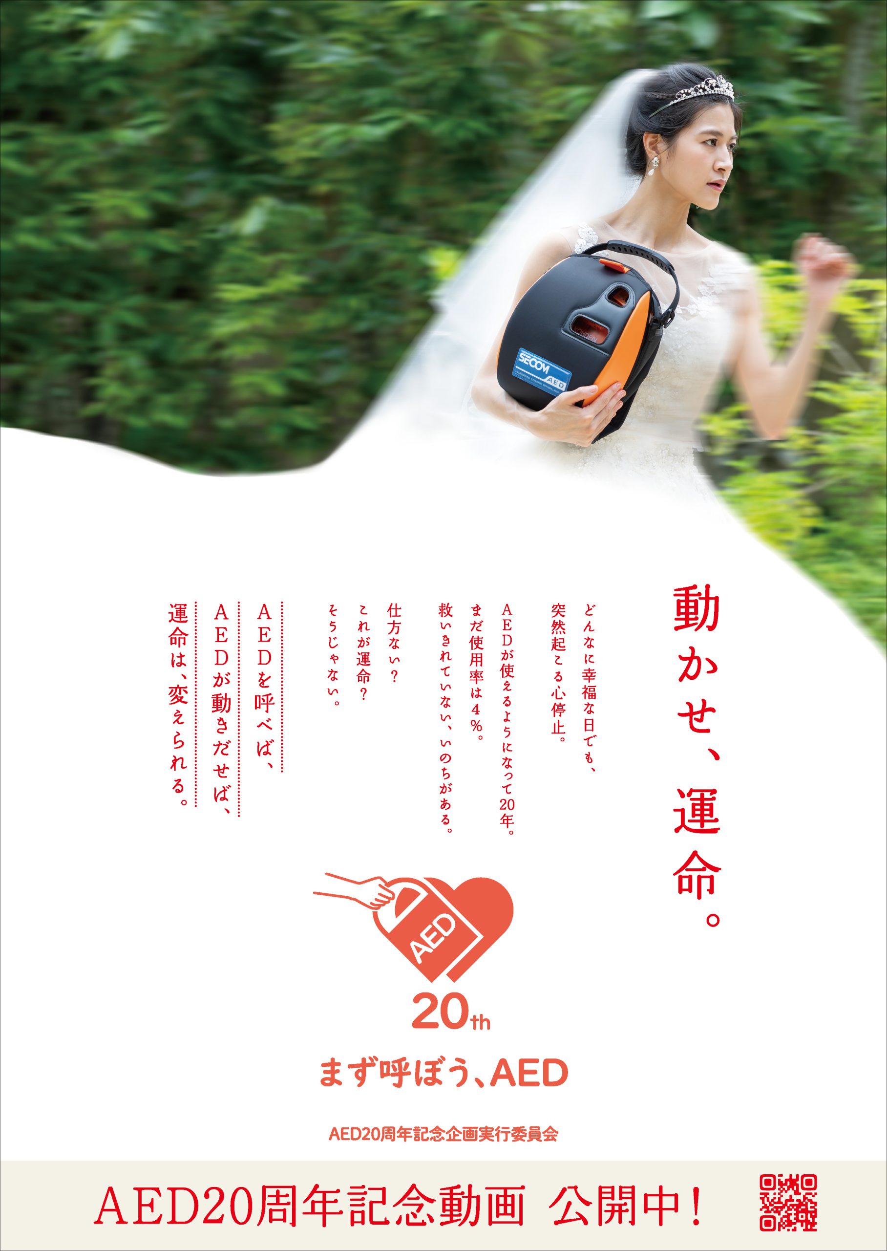 AEDの一般解禁を記念するムービーおよびポスターの制作です。100秒、30秒ver.を制作し、2025年7月14日に開催された「AEDシンポジウム」での放映をはじめ、助成元である宝くじ協会の承認後、WEBで配信予定です。現在、AEDは日本全国に70万台近くが設置されているにもかかわらず、使用率は4.1%に低迷しています。その理由は、「身近でない」「厄介ごとに巻き込まれたくない」「使い方がわからない」などが挙げられます。そこで、結婚式という心停止からは想像しづらい意外性のあるシチュエーションで興味をもってもらったうえで、救命措置の手順、いのちを救うことの意義やいざというときに勇気をもってもらえる内容で訴求しました。ポスターでも、花嫁がAEDを抱えて走る印象的なビジュアルで、AEDおよび動画への興味喚起を図っています。