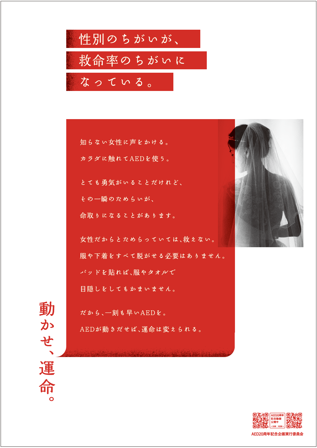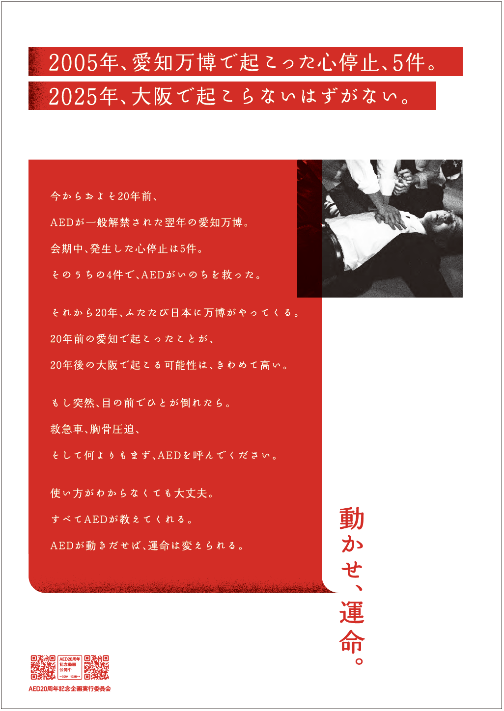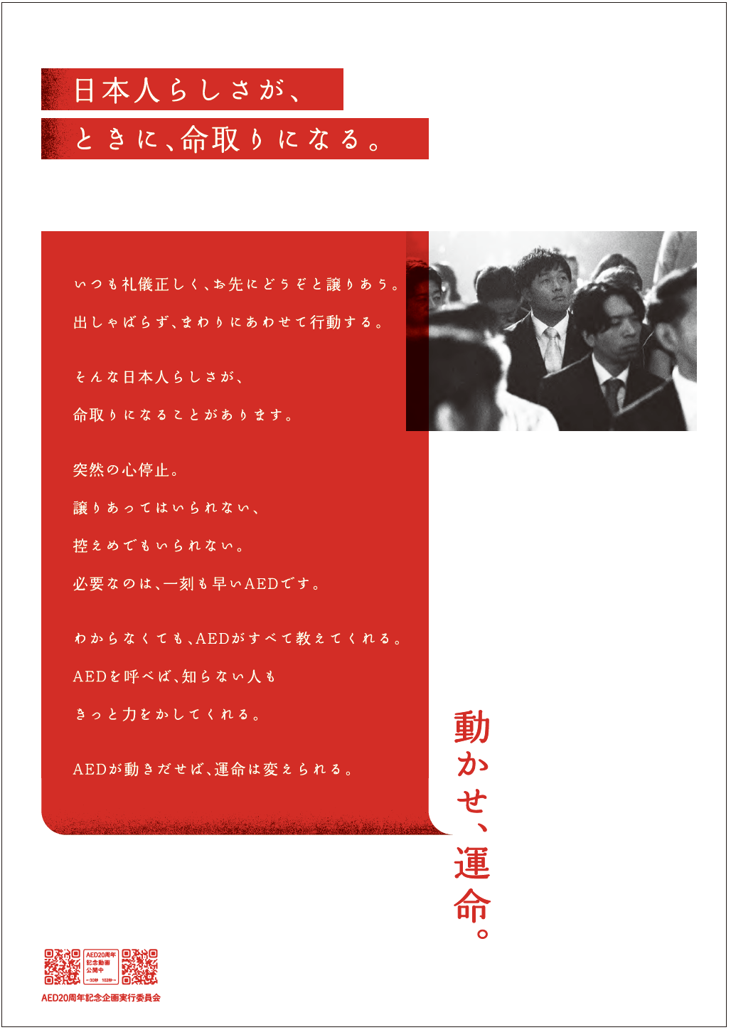 低迷するAEDによる電気ショック実施率向上を目的としたB1ポスターです。「AEDシンポジウム」をはじめ、日本AED財団が主催するイベントや関連施設等で掲出されます。AEDの使用が一般の方にも解禁されて20年になりますが、実際の実施率は4%台と低迷。その原因には、情報不足による誤った思い込みや、社会的な背景、文化的な側面、ひいては日本人のメンタリティにいたるまで、さまざまな要因が複合的にからんでいます。その原因となっている課題を浮き彫りにしコピーとして提示することで、これまで使用を阻んできた認識や意識を変えるきっかけづくりを狙いました。また、やや脅迫的なビジュアルとともに、心停止がけっして無関係な出来事ではなく、すべてのひとの日常のそばにあるという危機感をもってもらうことを意図しています。