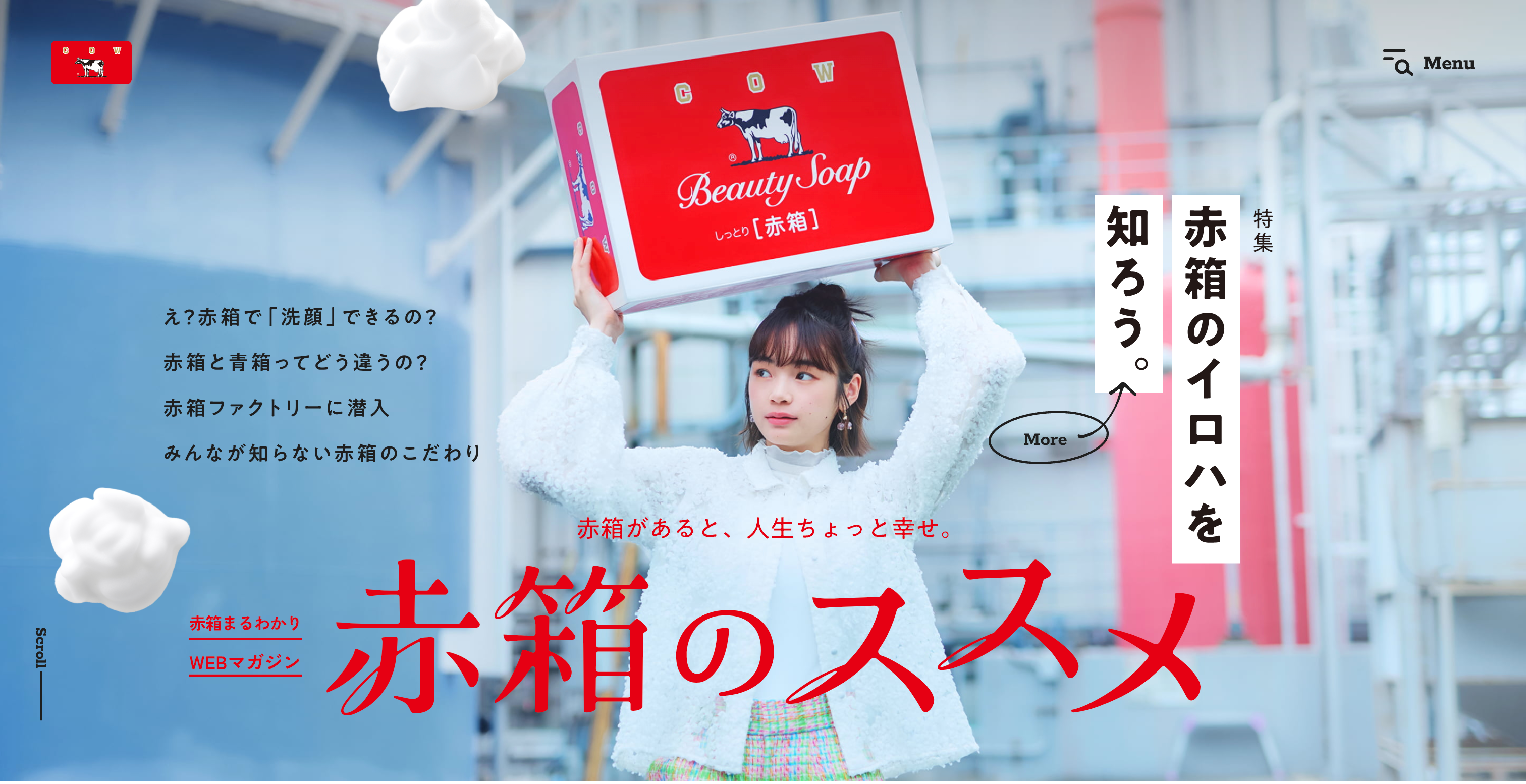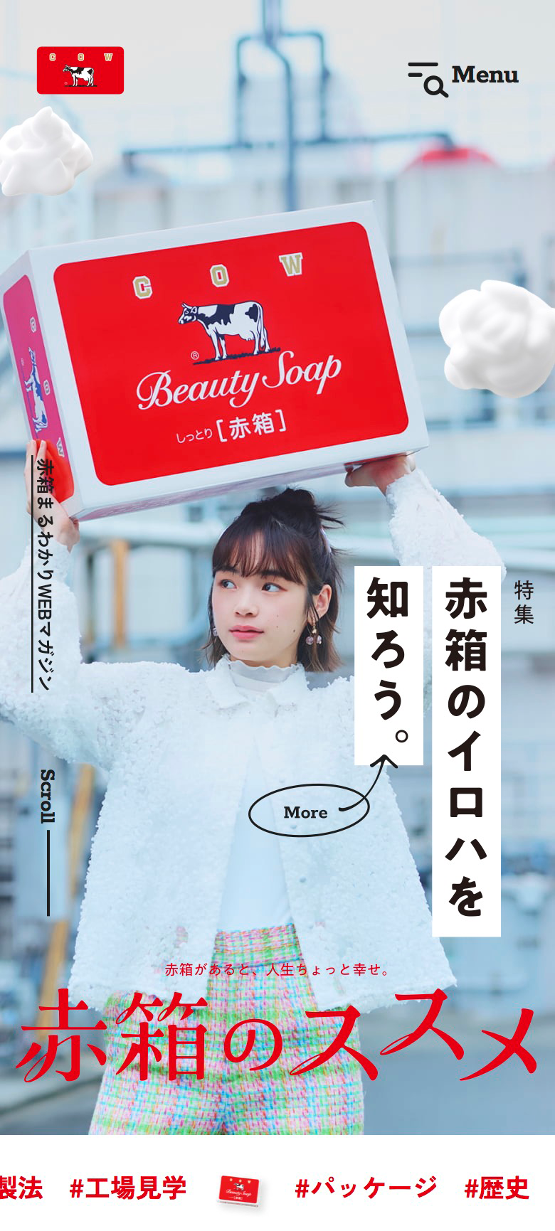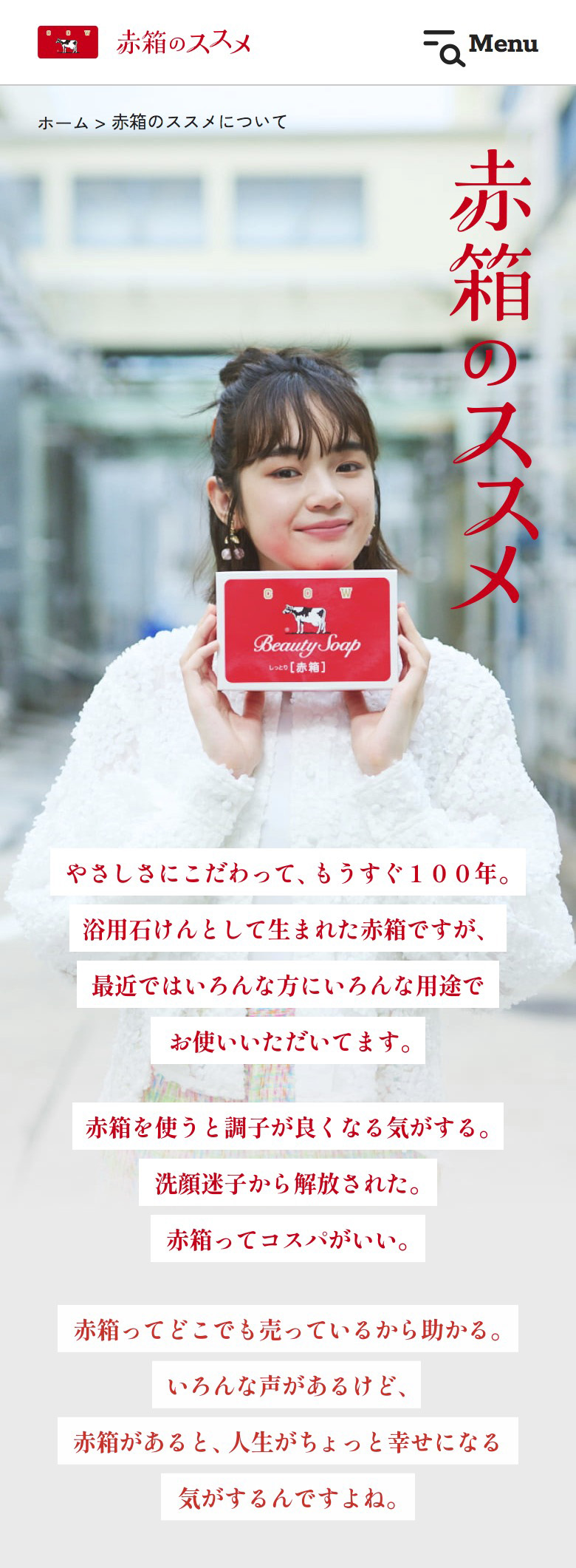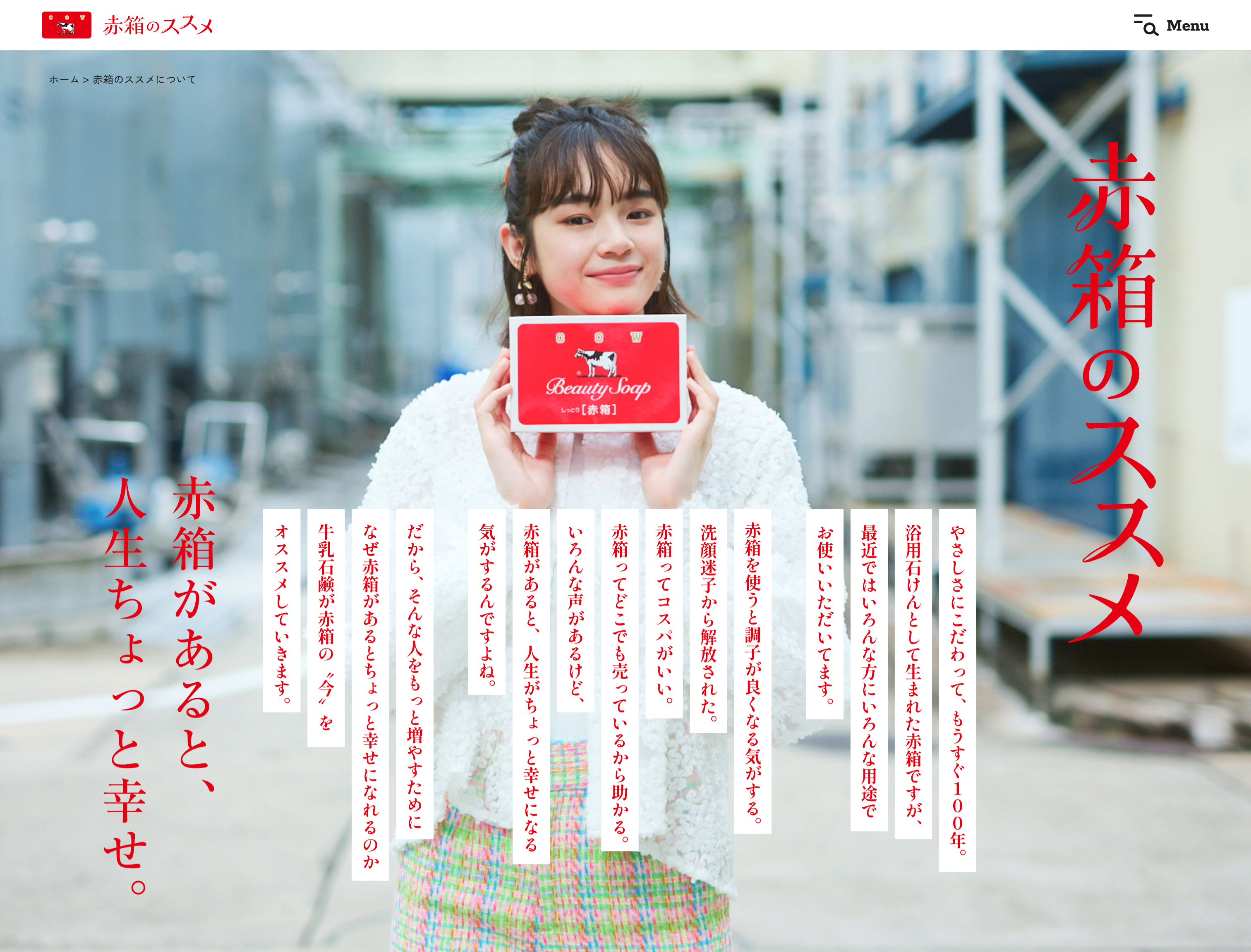 発売から90年を超える牛乳石鹸のロングセラー商品であるカウブランド 赤箱。そんな赤箱は浴用石けんとして生まれましたが、最近では洗顔に使われるなどさまざまな用途としても使用されています。そこで歴史ある赤箱の”今”を伝えるべく赤箱まるわかりマガジン「赤箱のススメ」と題して、赤箱のさまざまな魅力を発信していくコンテンツにしていければと思っております!